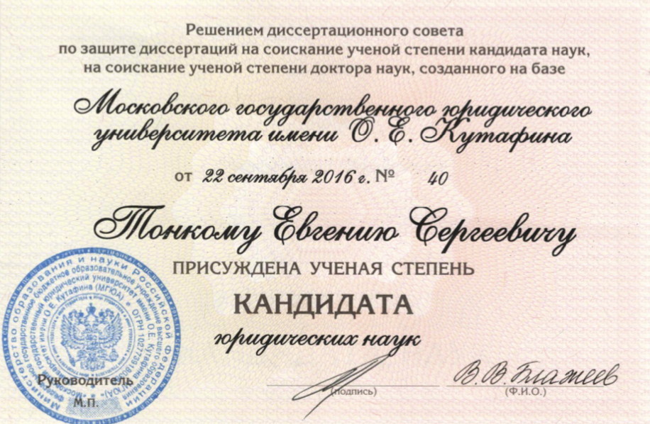- Аспирантура Московского Государственного Юридического Университета им. О.Е. Кутафина (МГЮА), кафедра криминалистики (2015г.).